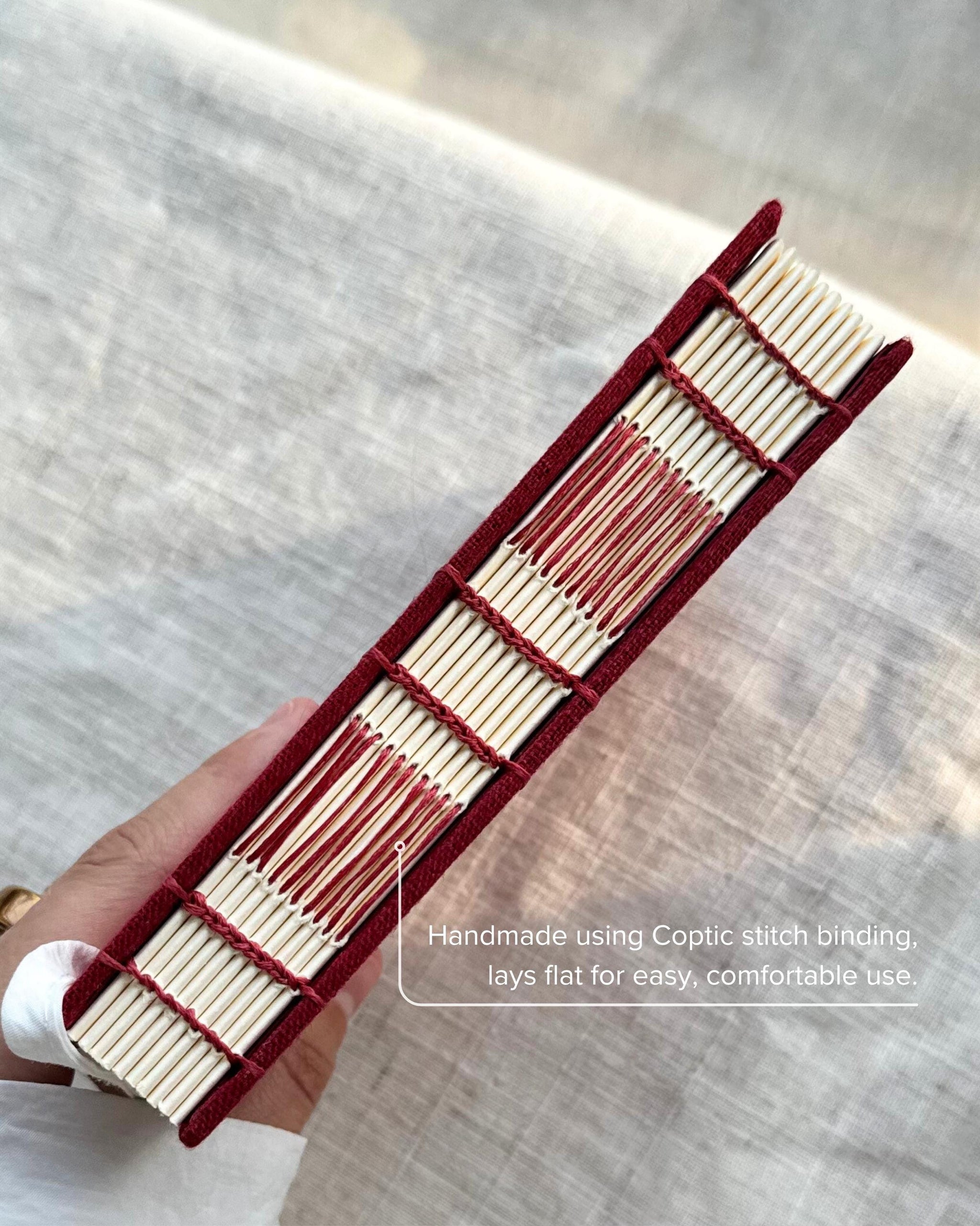 • Binding: exposed spine, Coptic stitch (opens flat)