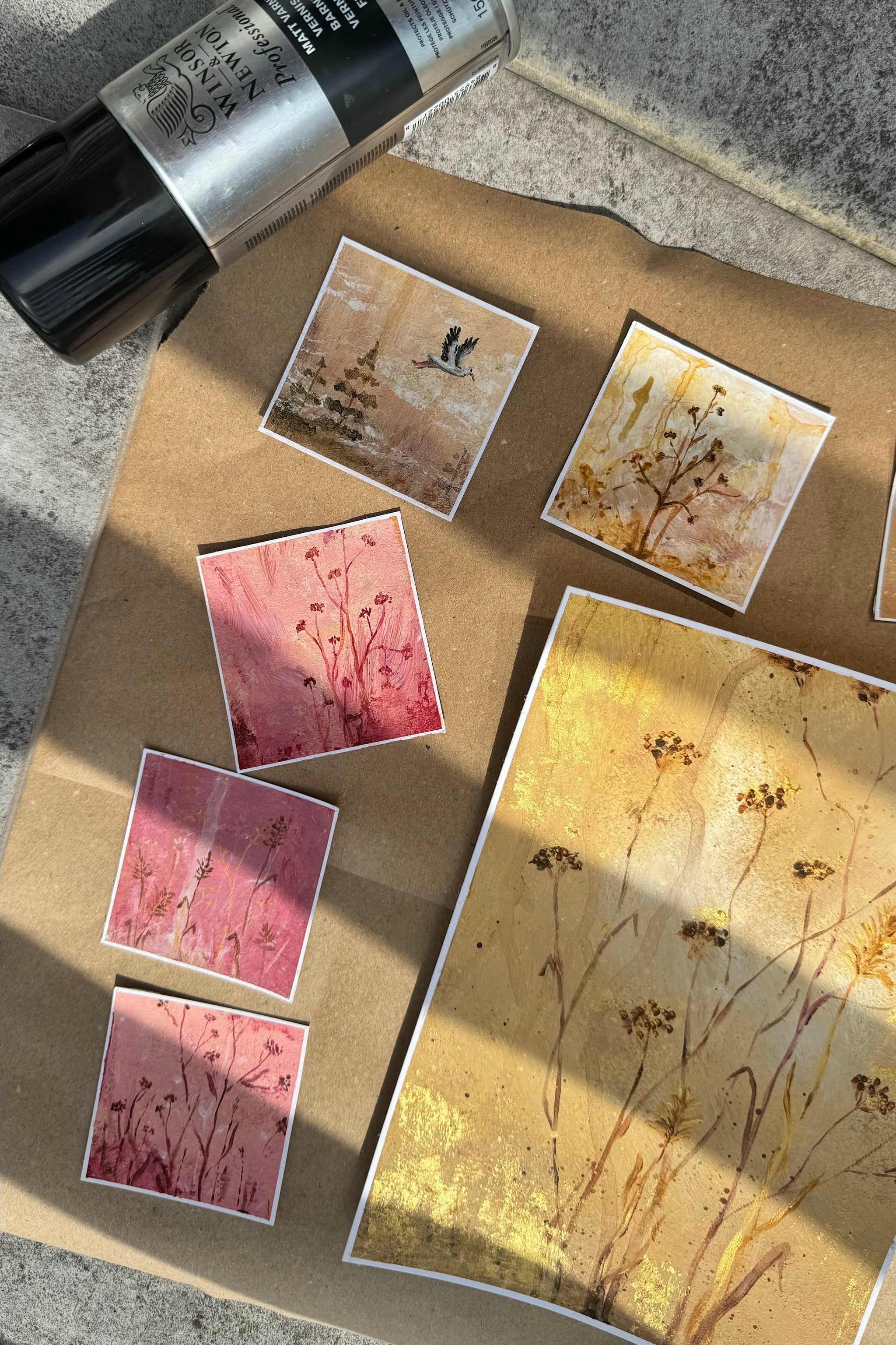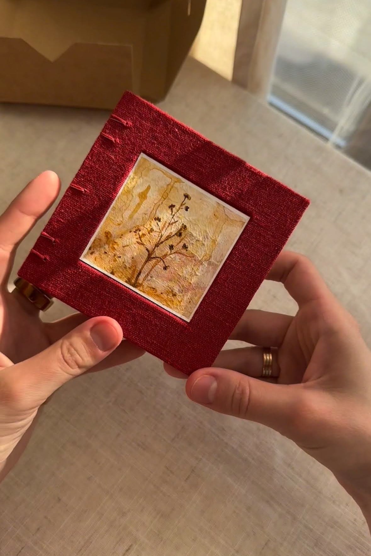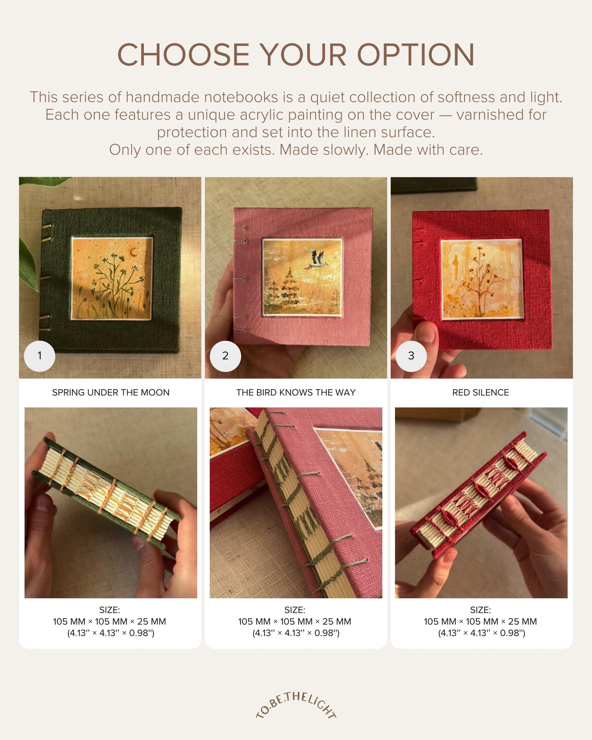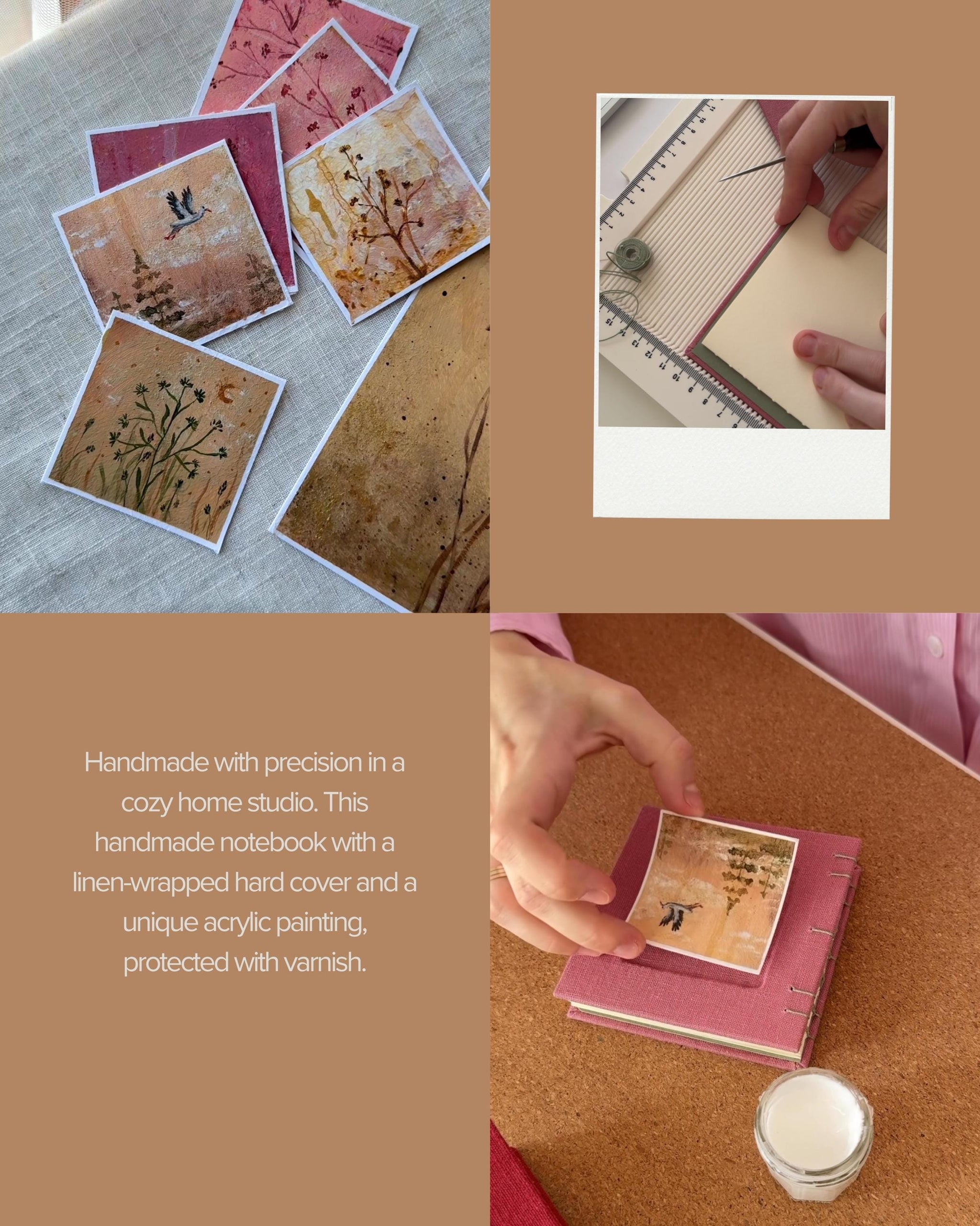 A handmade series of linen unique handmade notebooks with miniature acrylic paintings. A quiet collection about softness, seasons, and the beauty of slowing down.