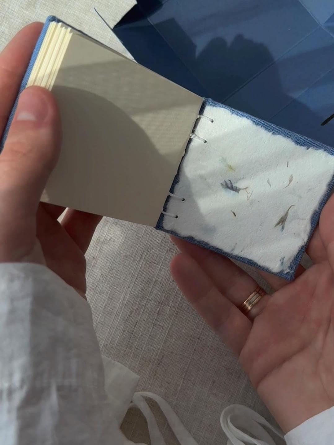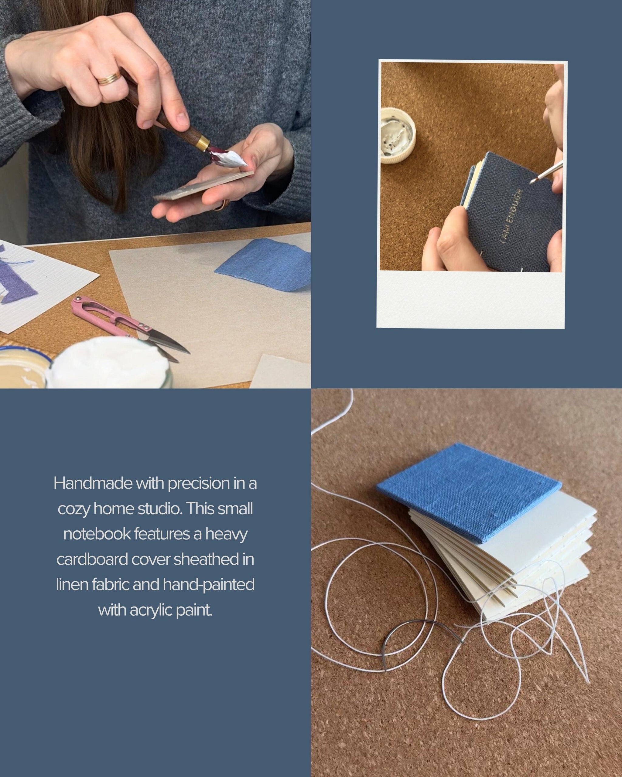 Unique handmade notebook which is made in a cozy home studio. This elegant small notebook features a heavy cardboard cover sheathed in linen fabric, hand-painted with an inspiring acrylic quote.