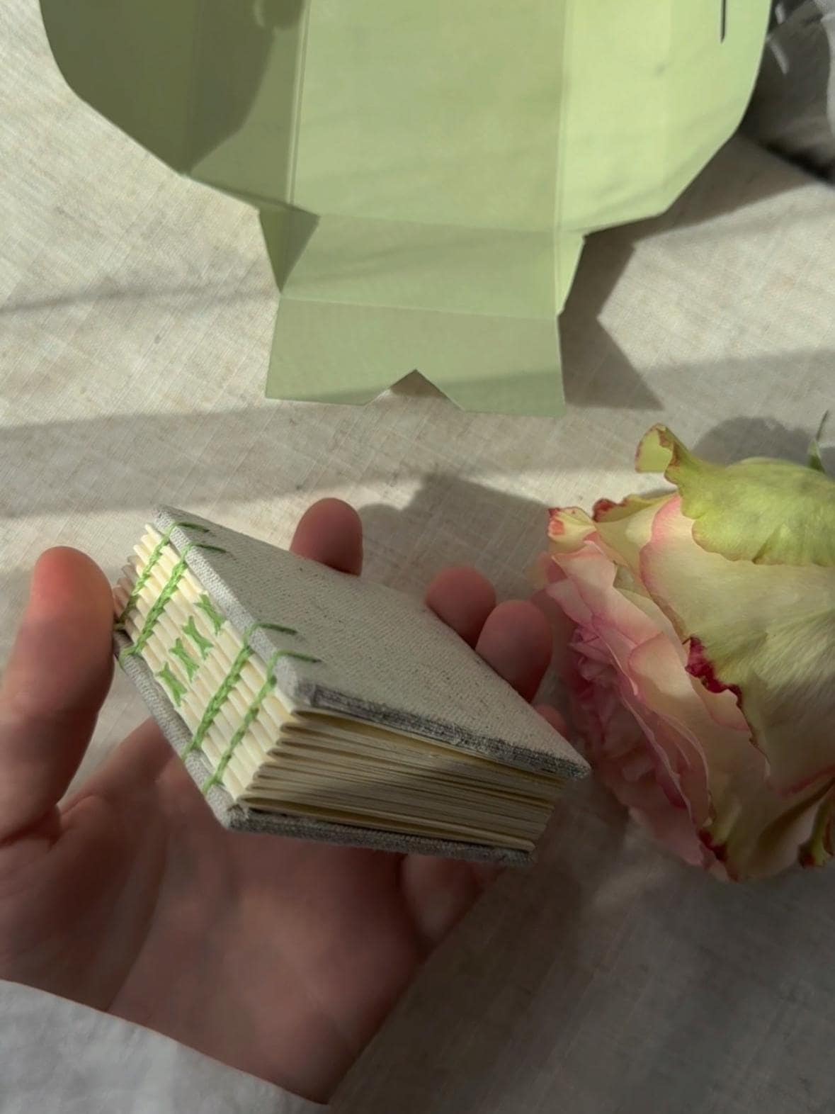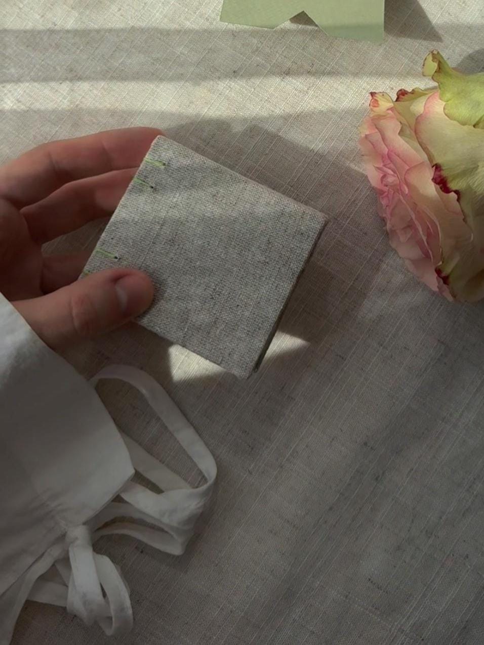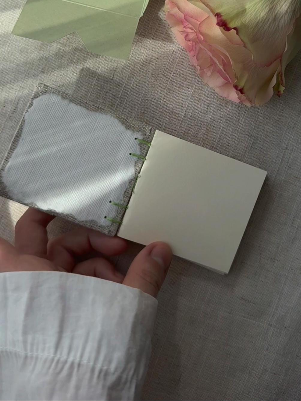 Unique handmade notebook which is made in a cozy home studio. This elegant small notebook features a heavy cardboard cover sheathed in linen fabric.