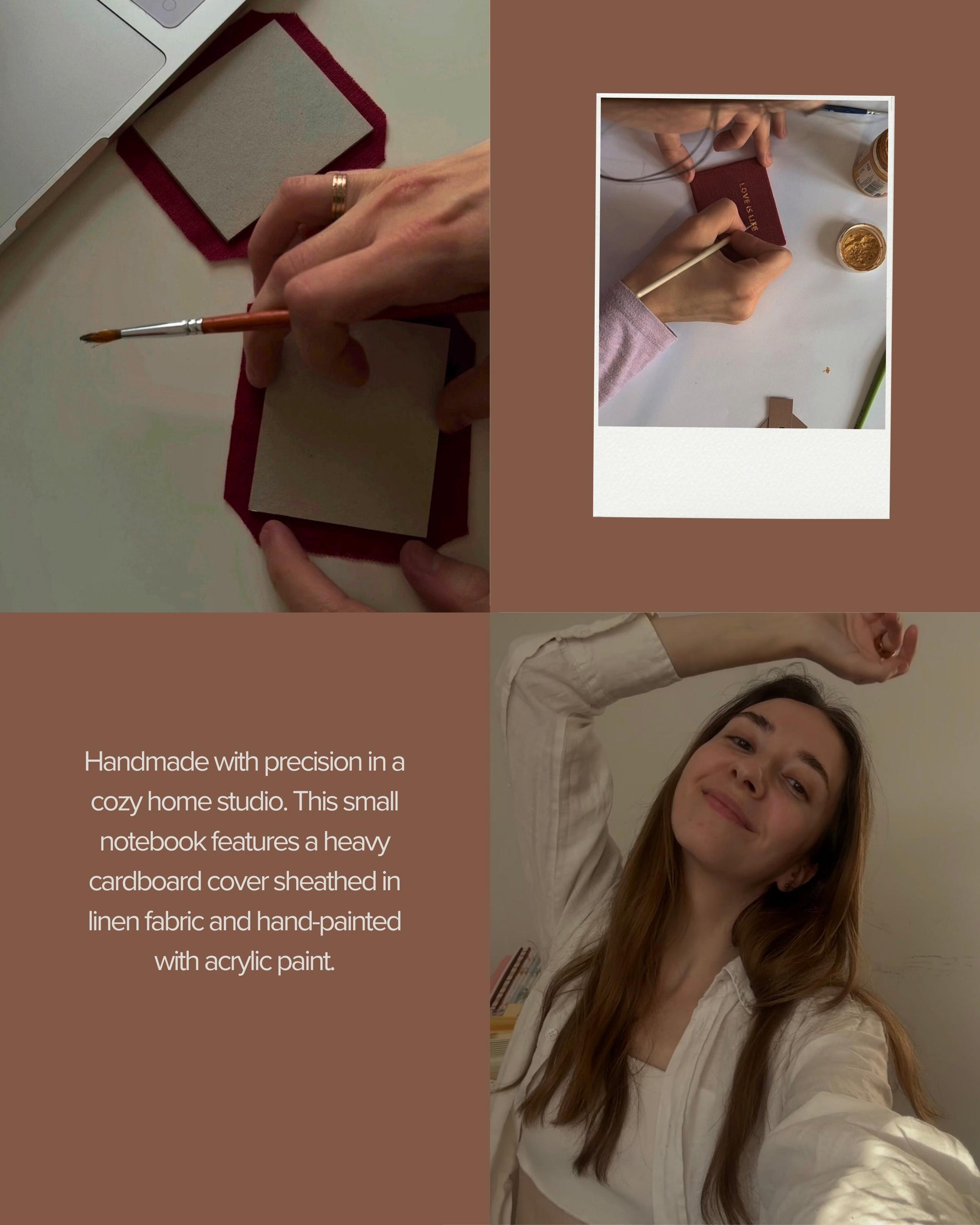 Handmade Unique small book (notebook) Cover made of dense cardboard, covered with linen fabric, with the inscription in acrylic paints on the cover: