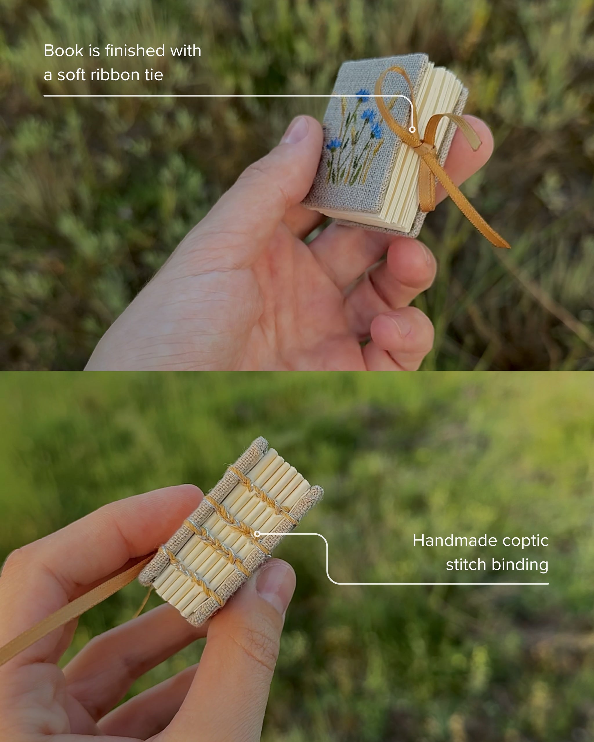 3.Mini book - Open Binding (Coptic Stitch) Product details: • Size: 35 × 43 × 18 mm (1.38" × 1.69" × 0.71") • 48 pages (24 sheets), 250 gsm cream paper, acid-free • Original acrylic painting on the cover • Hardcover wrapped in natural linen • Coptic stitch binding (opens flat) • Book is finished with a soft ribbon tie — a simple, tactile detail to gently close the cover. • Made slowly. With care.