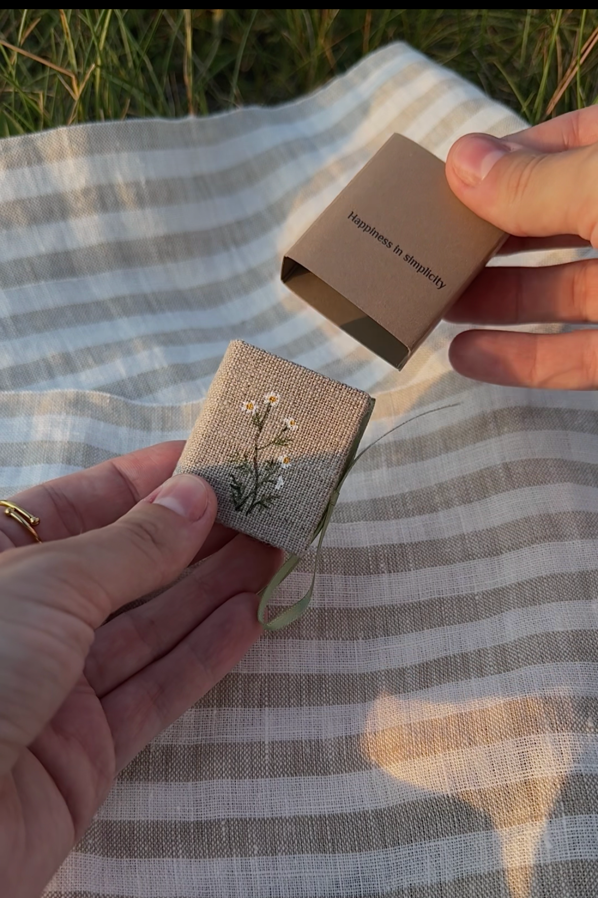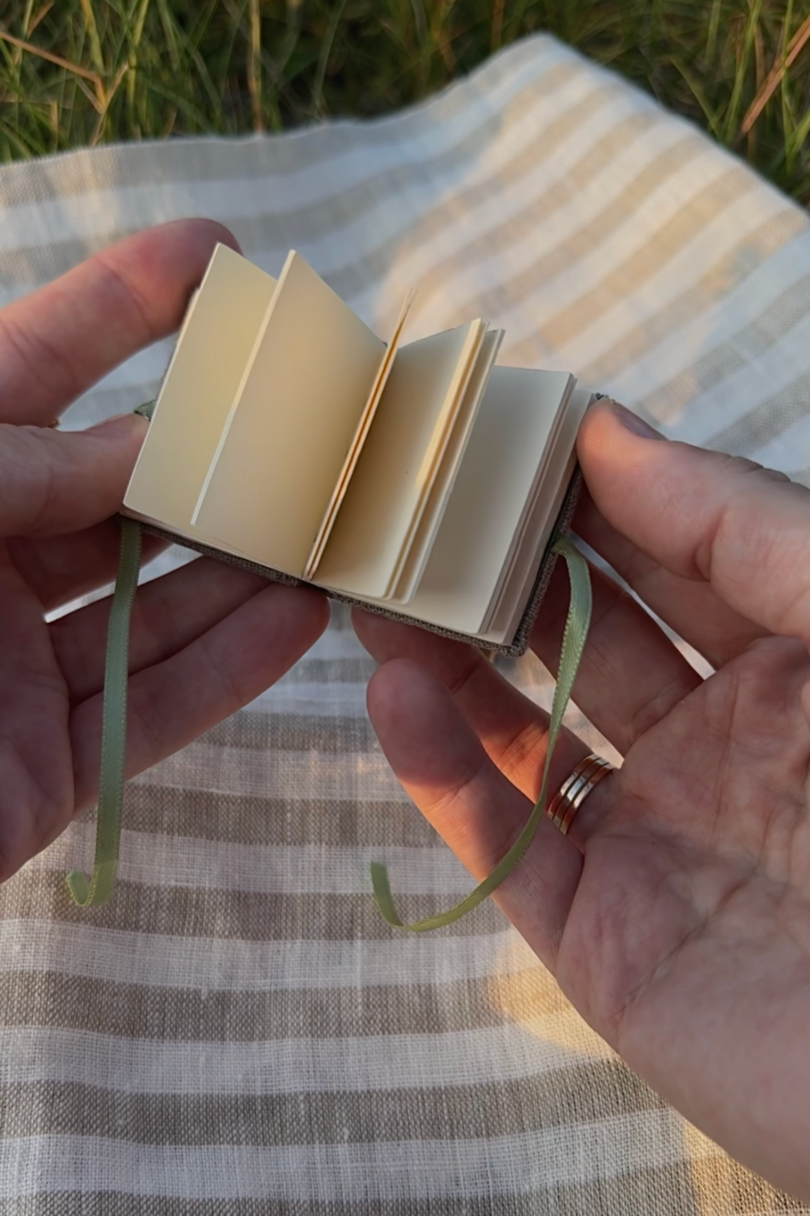2. Mini book - Closed Binding Product details: • Size: 40 × 44 × 17 mm (1.57" × 1.73" × 0.67") • 48 pages (24 sheets), 250 gsm cream paper, acid-free • Original acrylic painting on the cover • Hardcover wrapped in natural linen • Closed spine binding • Book is finished with a soft ribbon tie — a simple, tactile detail to gently close the cover. • Made slowly. With care.