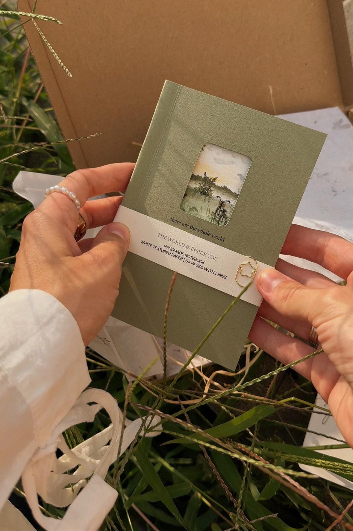 Product details: - Approximate size: 100mm W x 145mm L x 7mm H - Cardboard cover with window. - Inside is a watercolour illustration that is coated with spray lacquer for protection. - 64 white textured pages with lines, 100g density. - Adhesive sewing binding.