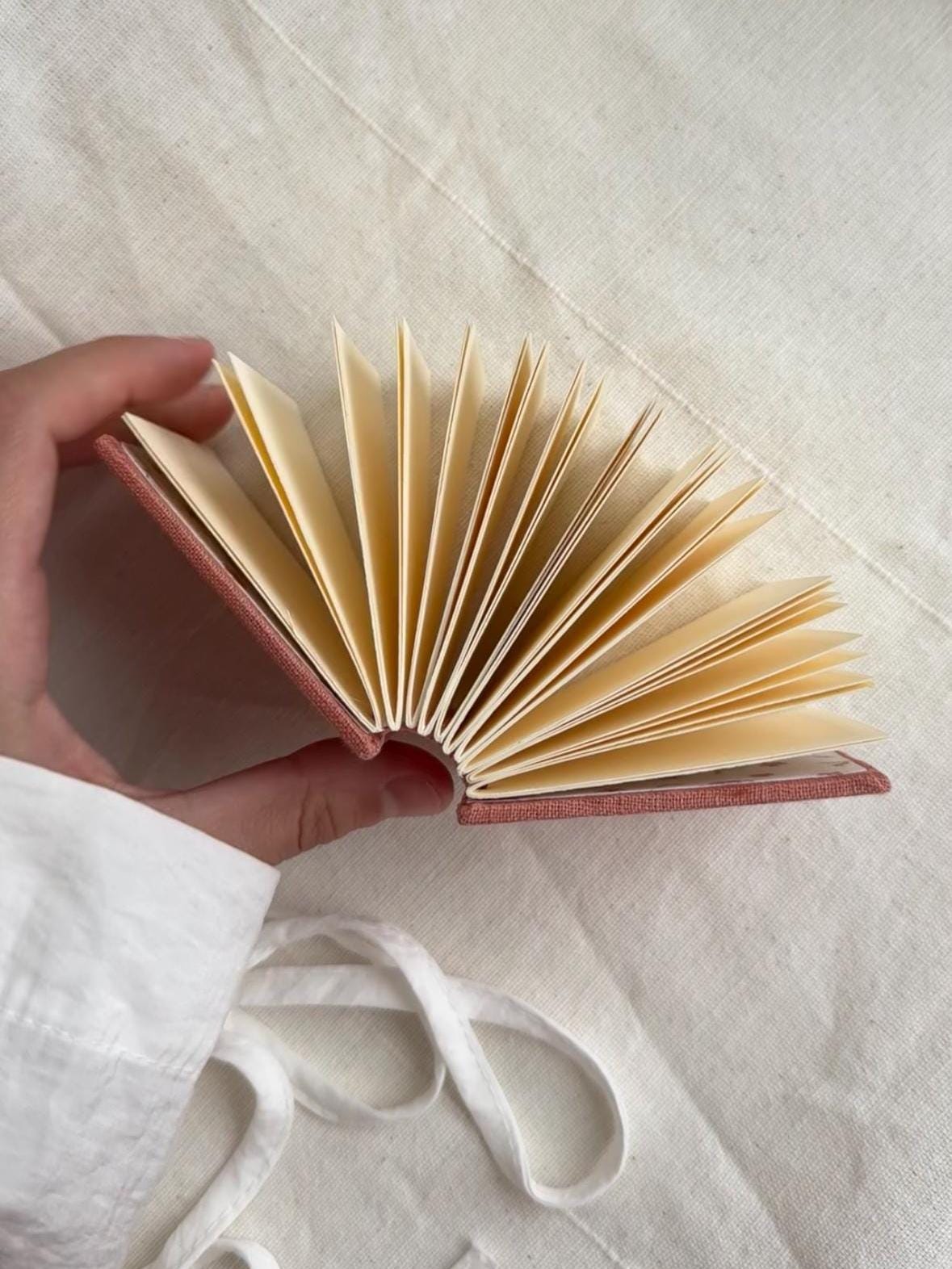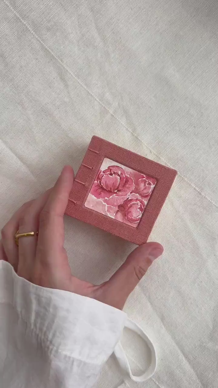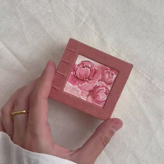 This unique handmade miniature book is a one-of-a-kind piece, crafted with love and care in a cozy home studio. The cover is wrapped in soft linen fabric in a warm rose tone, and features an original hand-painted watercolor illustration of blooming peonies, sealed with protective varnish to ensure lasting beauty.