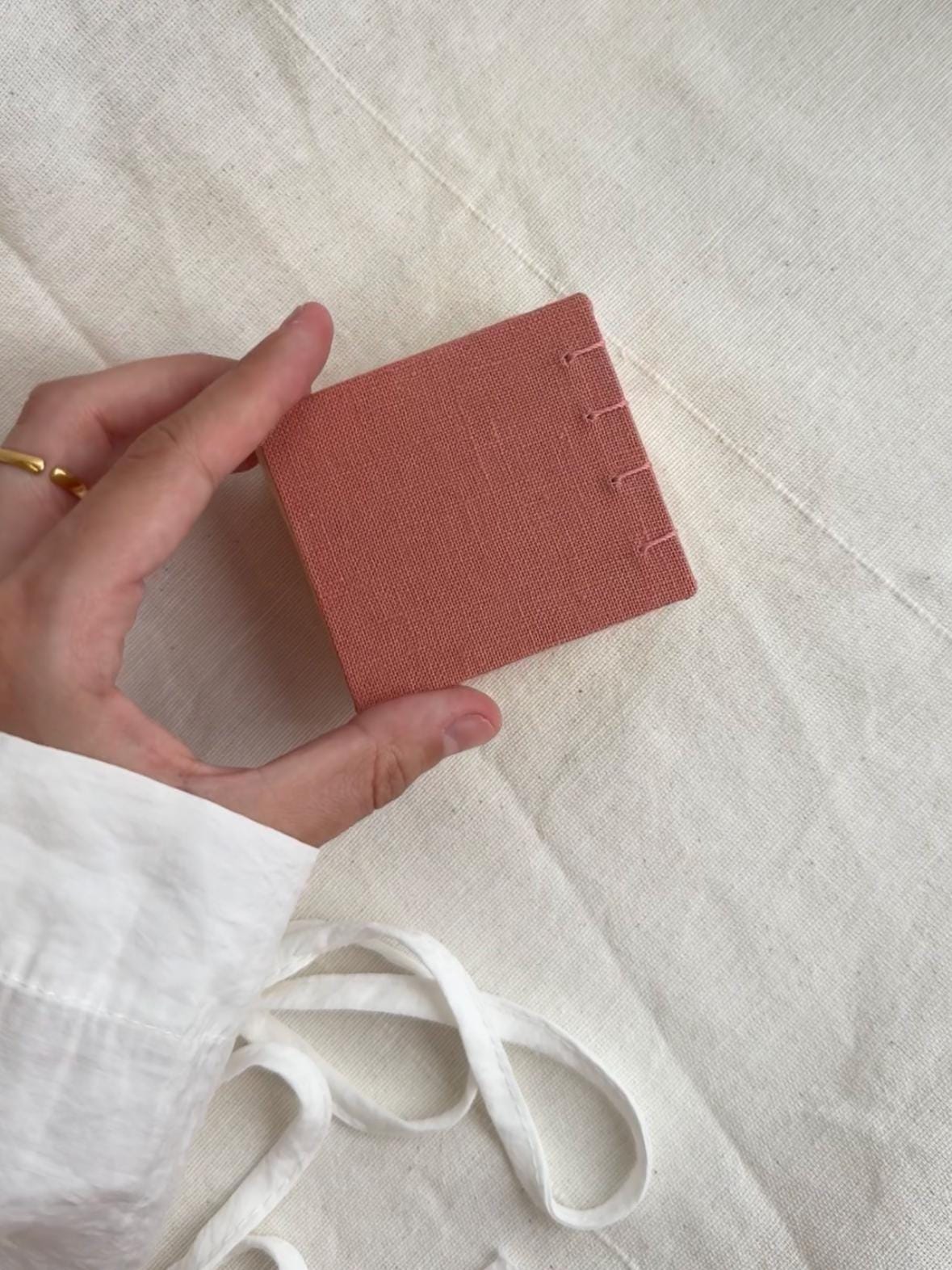 Its compact size makes it perfect as a pocket journal, a tiny sketchbook, a gratitude log, or a special gift for someone who appreciates delicate, meaningful things. The book is hand-stitched using the Coptic stitch binding technique, allowing it to lay completely flat when open.