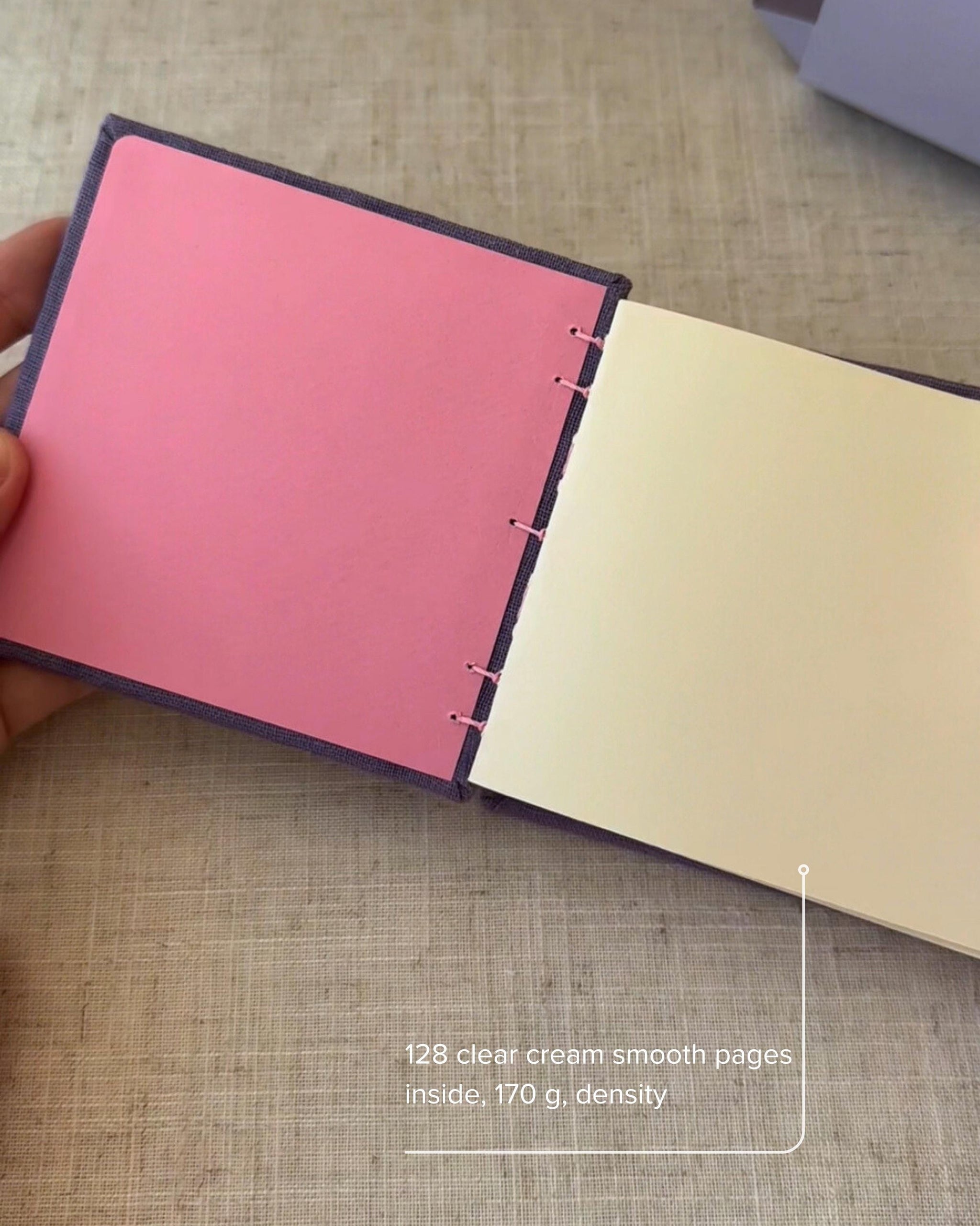 Details: • Size: 104mm x 104mm x 26mm (4.09" x 4.09" x 1.02") • 128 smooth cream pages, 170 gsm • Hardcover wrapped in natural linen • Hand-stitched binding with soft pink threads • Opens flat for easy writing or drawing