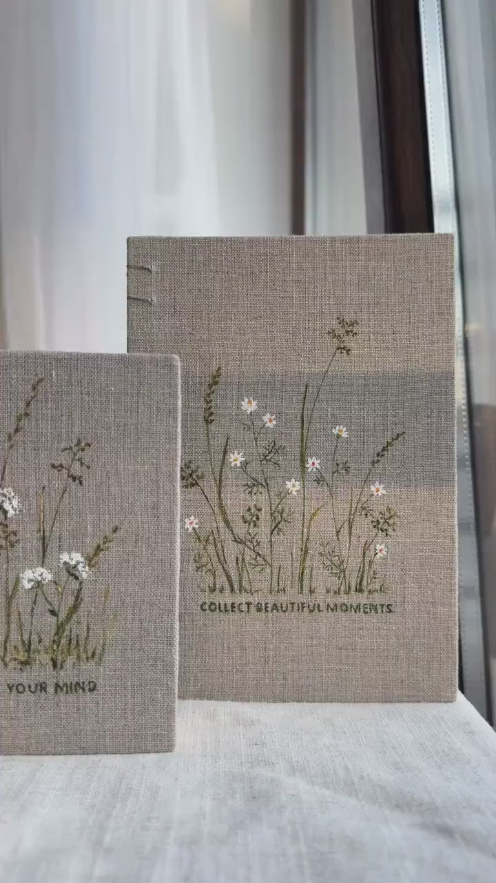 The cover is wrapped in textured linen and features original acrylic artwork — painted by hand with care.