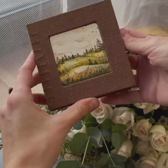 Handmade unique book with a heavy cardboard cover covered with linen fabric and an original watercolour illustration varnished for protection.