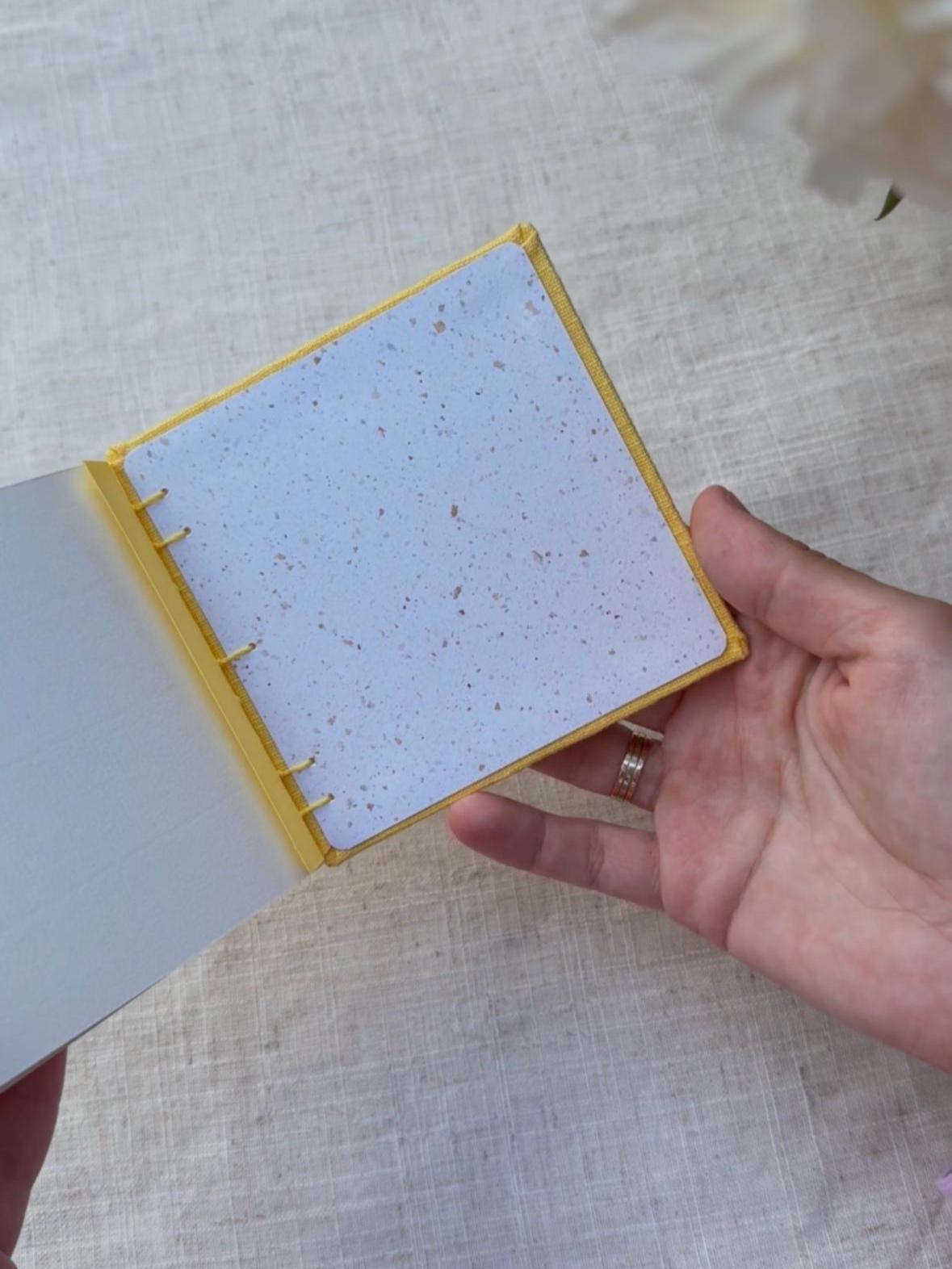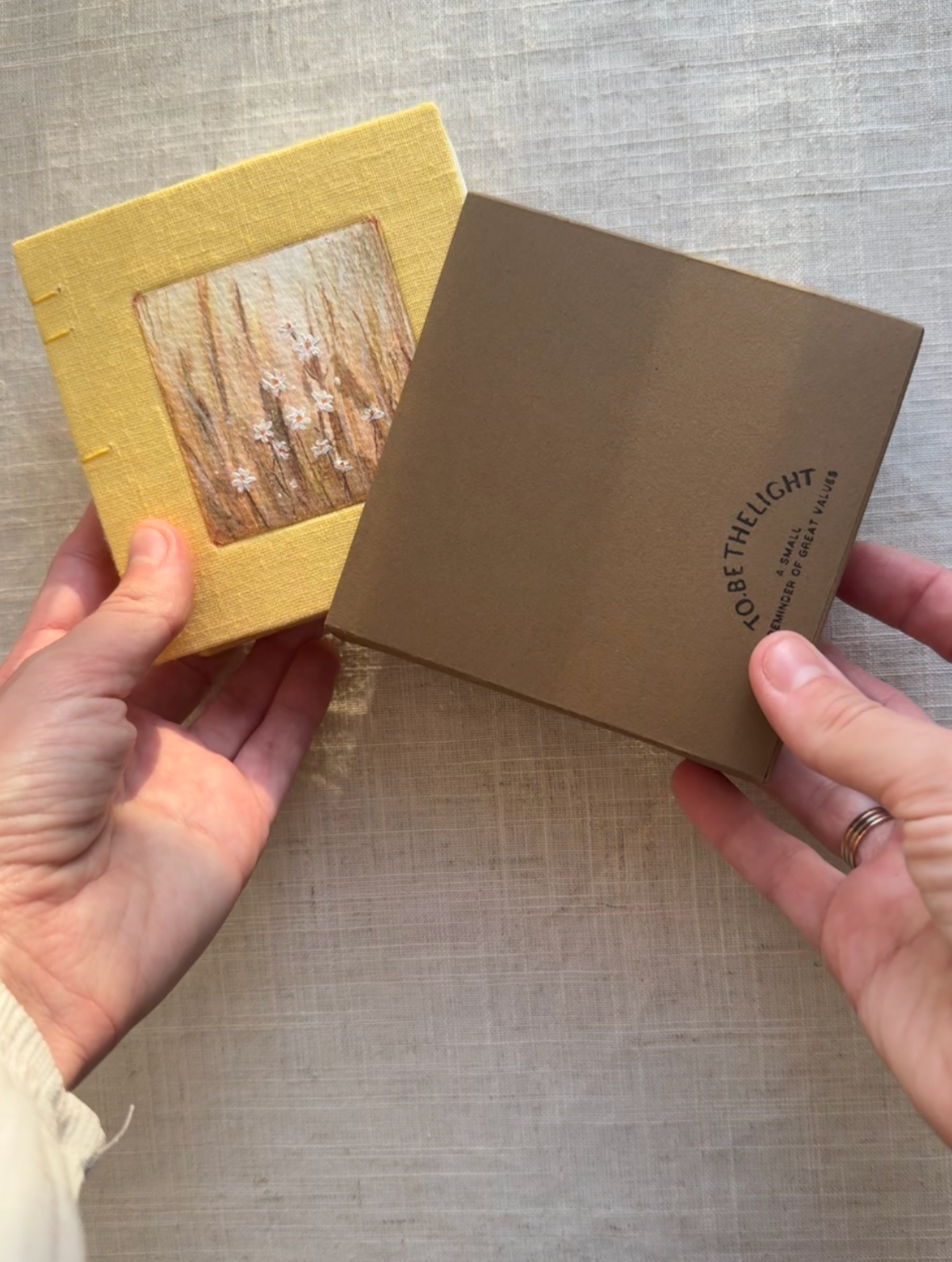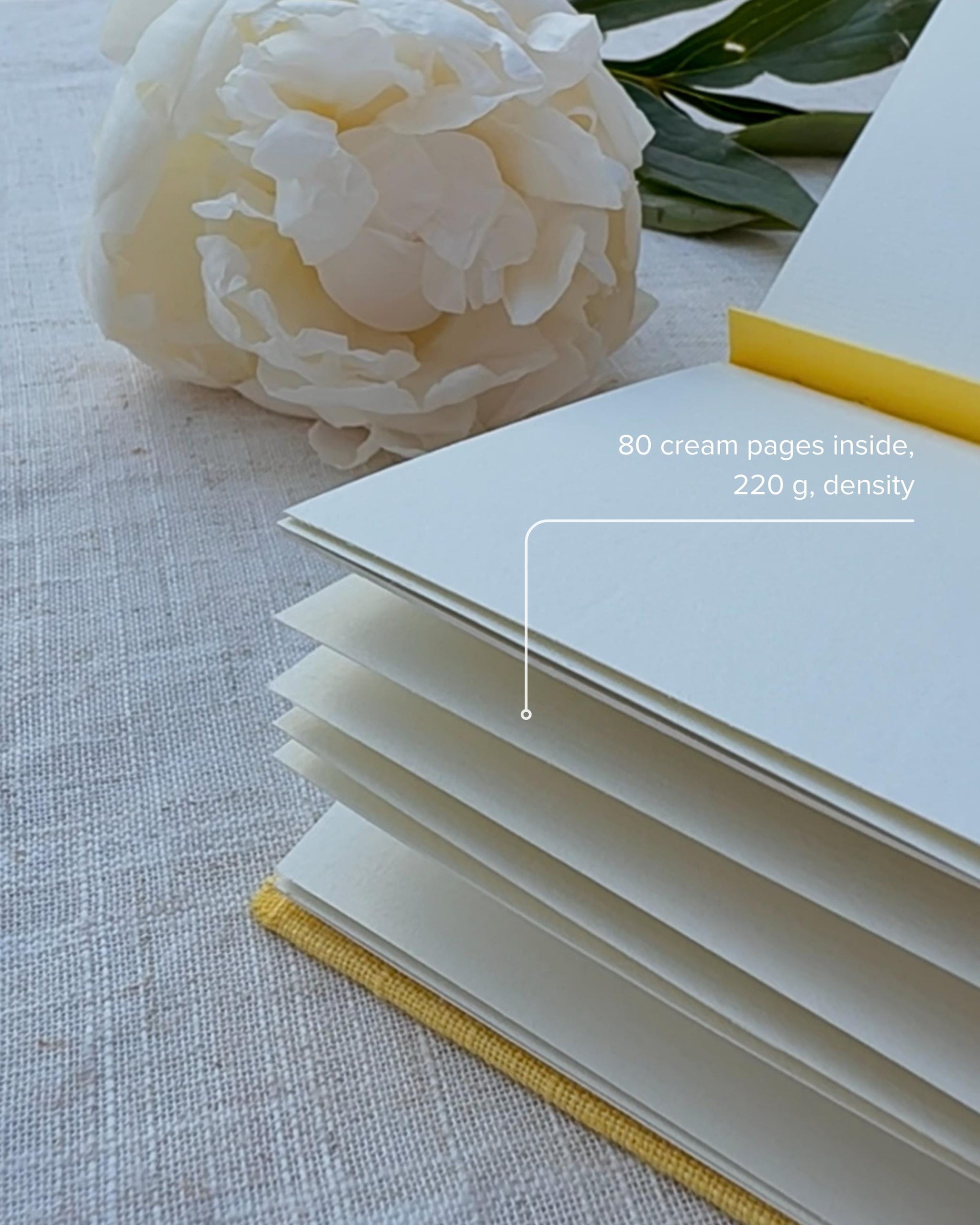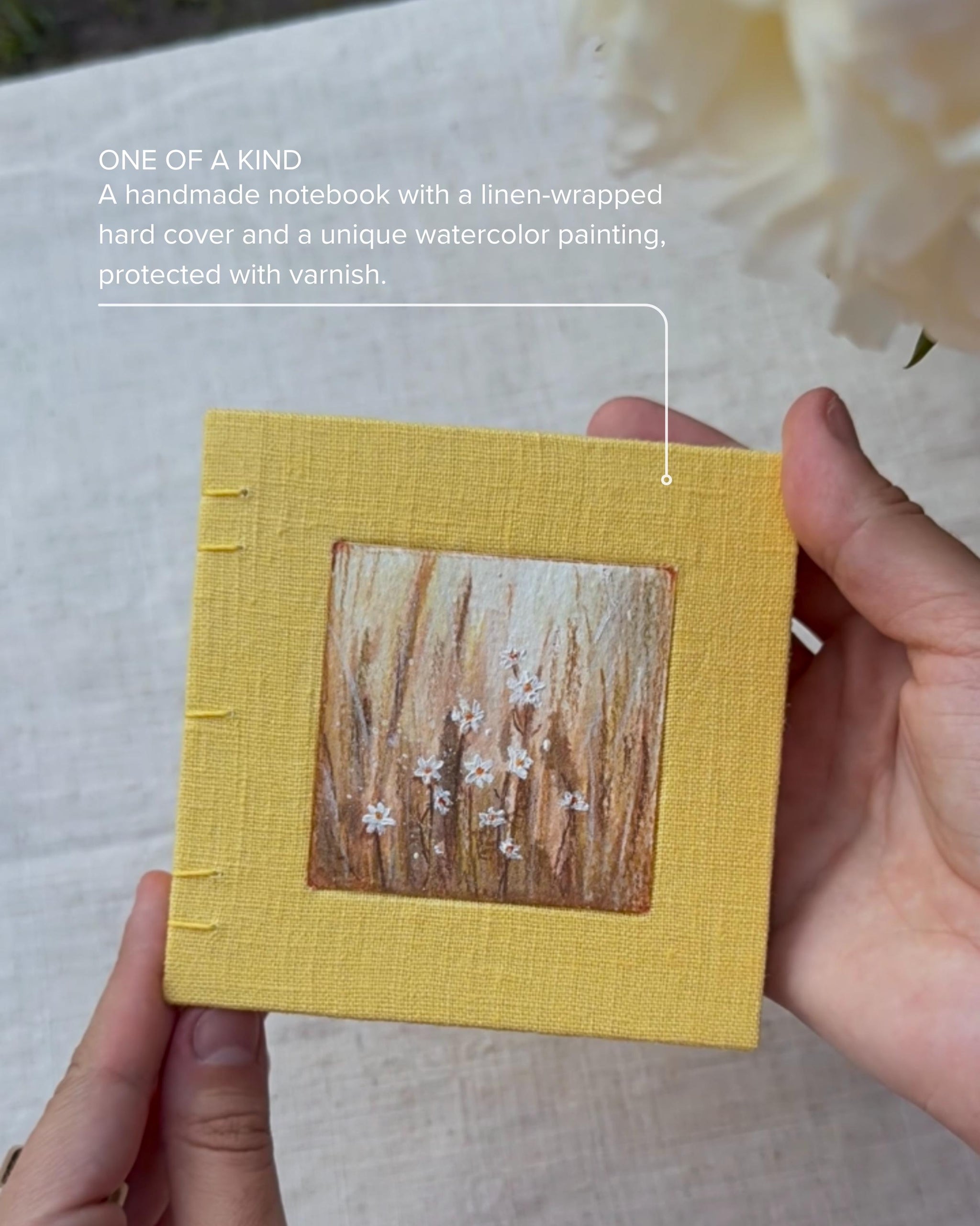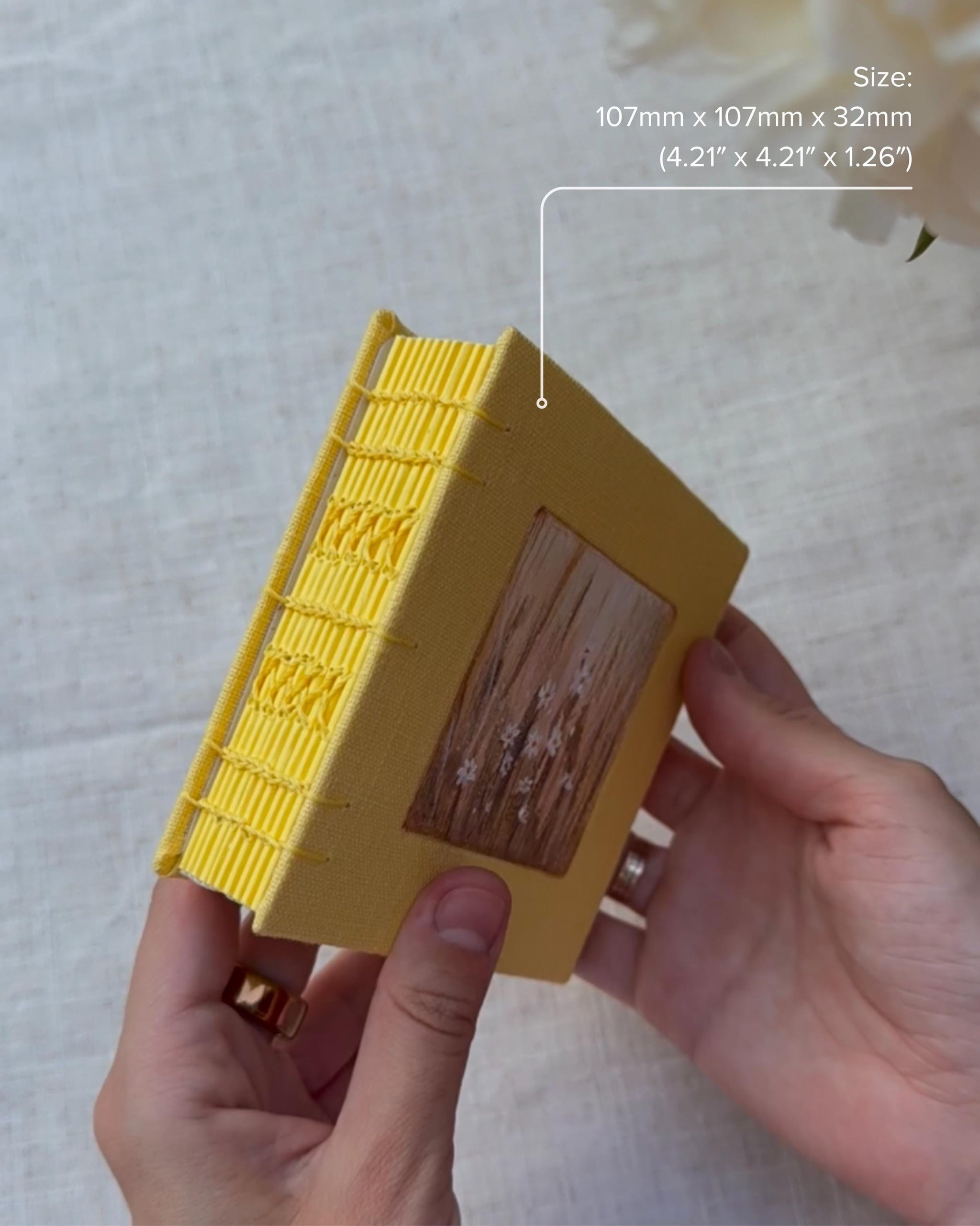Product Details: Size: 107mm x 107mm x 32mm (4.21″ x 4.21″ x 1.26″) • Pages: 80 cream-colored pages (40 sheets), 220 gsm — ideal for writing, sketching, journaling, or collecting memories • Cover: Hardcover wrapped in premium linen fabric • Artwork: Original watercolor painting on the cover, sealed with protective varnish • Binding: Hand-stitched using the traditional Coptic stitch technique — opens completely flat for effortless use