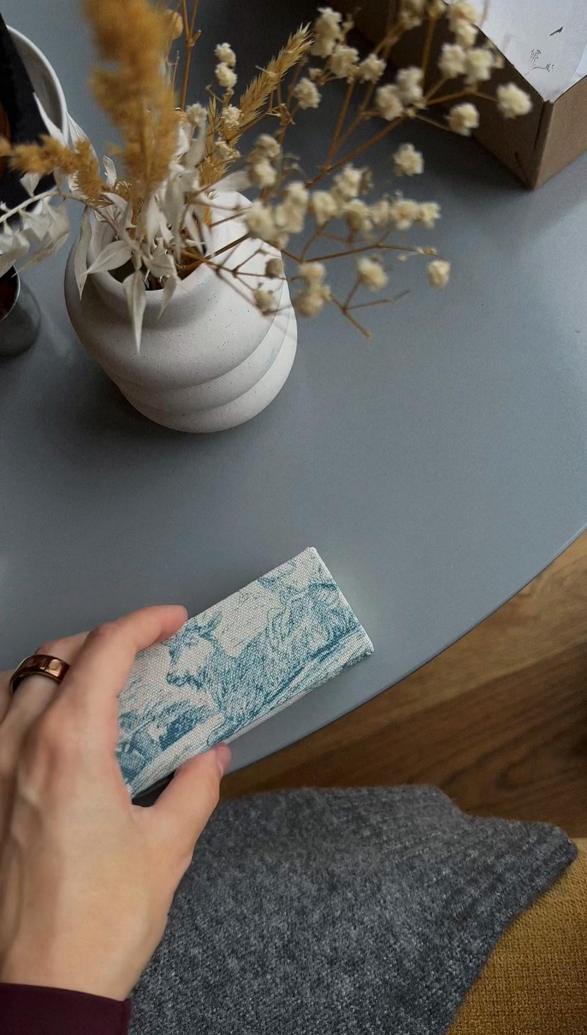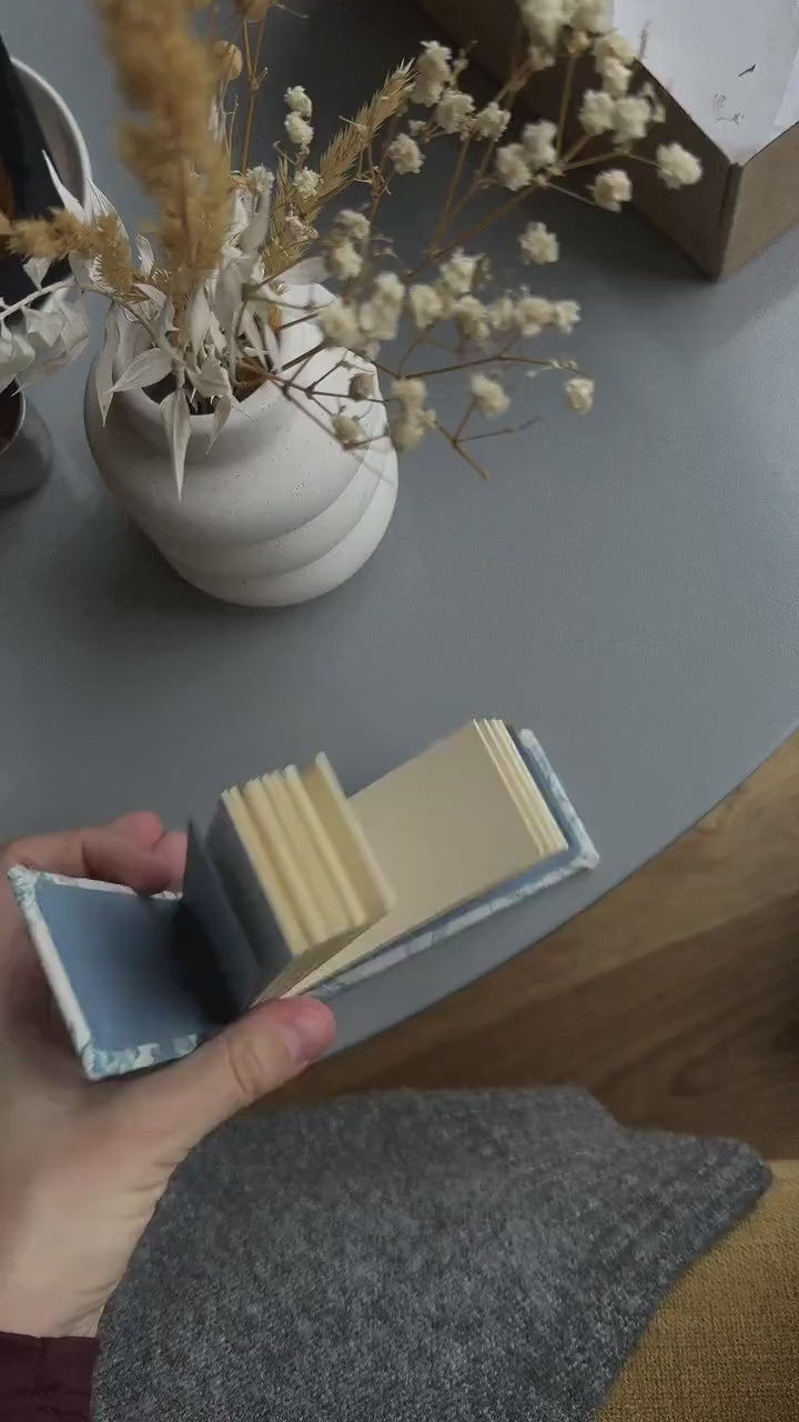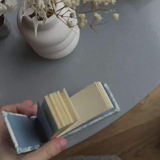 Handmade unique small notebook with a heavy cardboard cover covered with linen fabric in vintage style.
